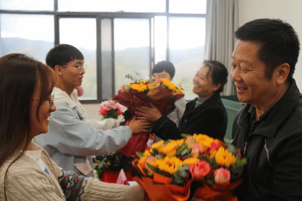 活动伊始,学生代表们向到会的谭兵老师、殷瑛老师送上鲜花与节日祝福,感谢他们为学校发展做出的贡献。
