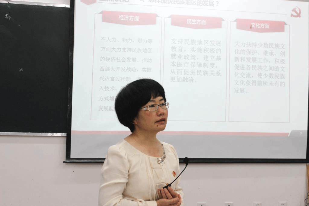 接着,在谈到“怎样加快民族地区的发展”这一问题时,高老师从以下三个方面作了重点讲解,一是经济方面,要支持民族地区的社会发展,推动西部大开发战略,实施兴边富民政策;二是民生方面,要支持民族地区教育的发展,实施积极的就业政策,建立完善的医疗保障体系;三是文化方面,要在文化上大力扶持民族文化的保护、继承、创新和发展,积极促进各民族间的文化交流。