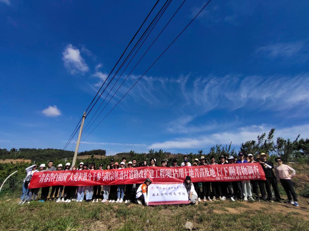 为深入学习贯彻习近平总书记在党史学习教育动员大会上的重要讲话精神,把习近平总书记在清华大学考察时重要讲话精神落到实处,国土空间信息学院本着把专业书写在大地上的教育理念,坚持学习党史与实践相结合,于5月8日组织开展了“传承红色基因”系列教育活动之青春告白祖国活动。此次活动的主要内容是组织学生入党积极分子参与阳宗镇通村道路改扩建工程项目占用土地青苗及地上(下)附着物调查工作。