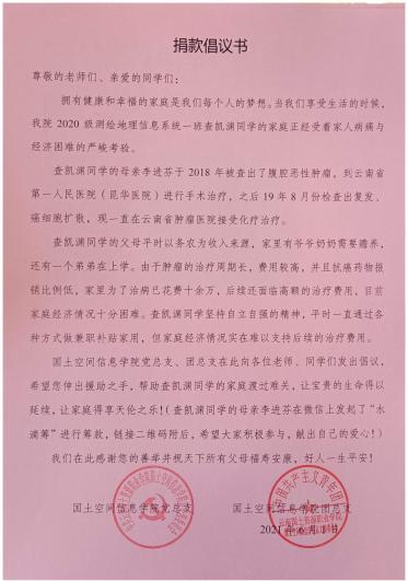 生命如此可贵,人生只有一次,但“天有不测风云,人有旦夕祸福”,近期,厄运就发生在世界杯体育官方网站2018级地籍测绘与土地管理2班李涛同学和2020级测绘地理信息技术1班学生查凯渊母亲李进芬的身上。李涛同学被查出颅内占位性病变,查凯渊母亲罹患腹腔恶性肿瘤,这给他们的家庭带来了非常严重的经济负担,把本来就不富裕的家庭更是推向了深渊。世界杯体育官方网站党总支、团总支了解到两位同学的情况后,立即向全院师生发出向他们爱心捐款的倡议活动。