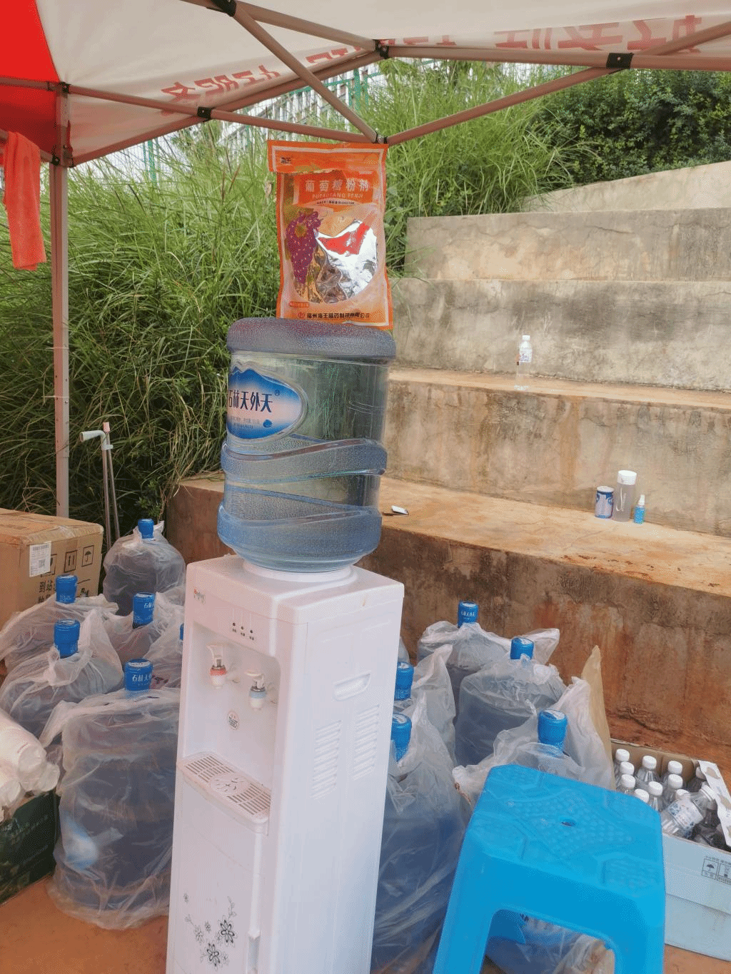学院党总支书记高昆、华图教育负责人、学院2021级辅导员老师们来到腾龙运动场,慰问军训学生,并亲自搭建帐篷,为正在炎炎烈日下军训的学生们送去了矿泉水、葡萄糖、藿香正气水、毛巾、饮水机等生活物品。