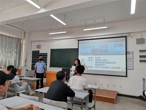讲座上,张警官首先从“2019年昆明市反诈年度数据报告”入手,分析了受骗人群的集中年龄段和案件类型。接着,张警官分别从“什么是电信诈骗,电信诈骗的常见形式,如何识别防范电信诈骗,被骗后的补救措施”四方面展开讲座内容。