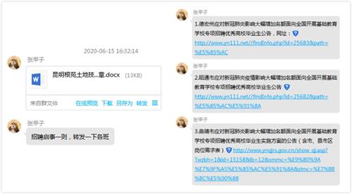 整合资源,精准推送。学院专业教师、辅导员积极整合学院专业对口企业招聘信息,在对招聘信息进行审核后,精准推送到毕业年级班群,确保每位毕业生有岗位可报、能报。班主任、辅导员及时掌握每位毕业生的就业状况、思想动态和求职意愿,积极将符合学生求职意愿的招聘信息转发至毕业生。