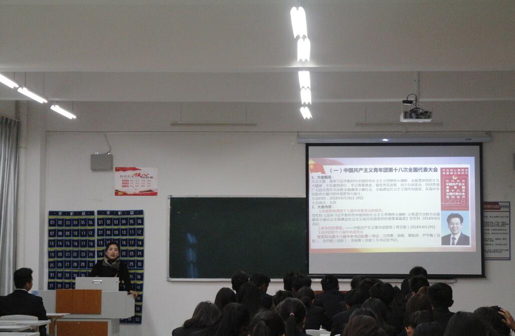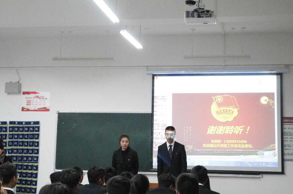 校团委书记关利钦首先强调作为新时代青年的我们应该不忘跟党初心,牢记青春使命。要努力争做中国共产主义青年团第十八次全国代表大会所提出的“新时代的共青团”。其次,关老师向同学们传达共青团云南省委十四届二次会议精神,动员同学们参加培训,向同学们阐述“政治建团、思想立团、固本兴团、改革强团、从严治团”的原则和思想。随后,关老师对基层组织建设、夯实团建基础进行讲解,要求团建方面严格执行“三会两制一课制度”,以班级团支部为基点务实基层团务,提高基层组织活力。