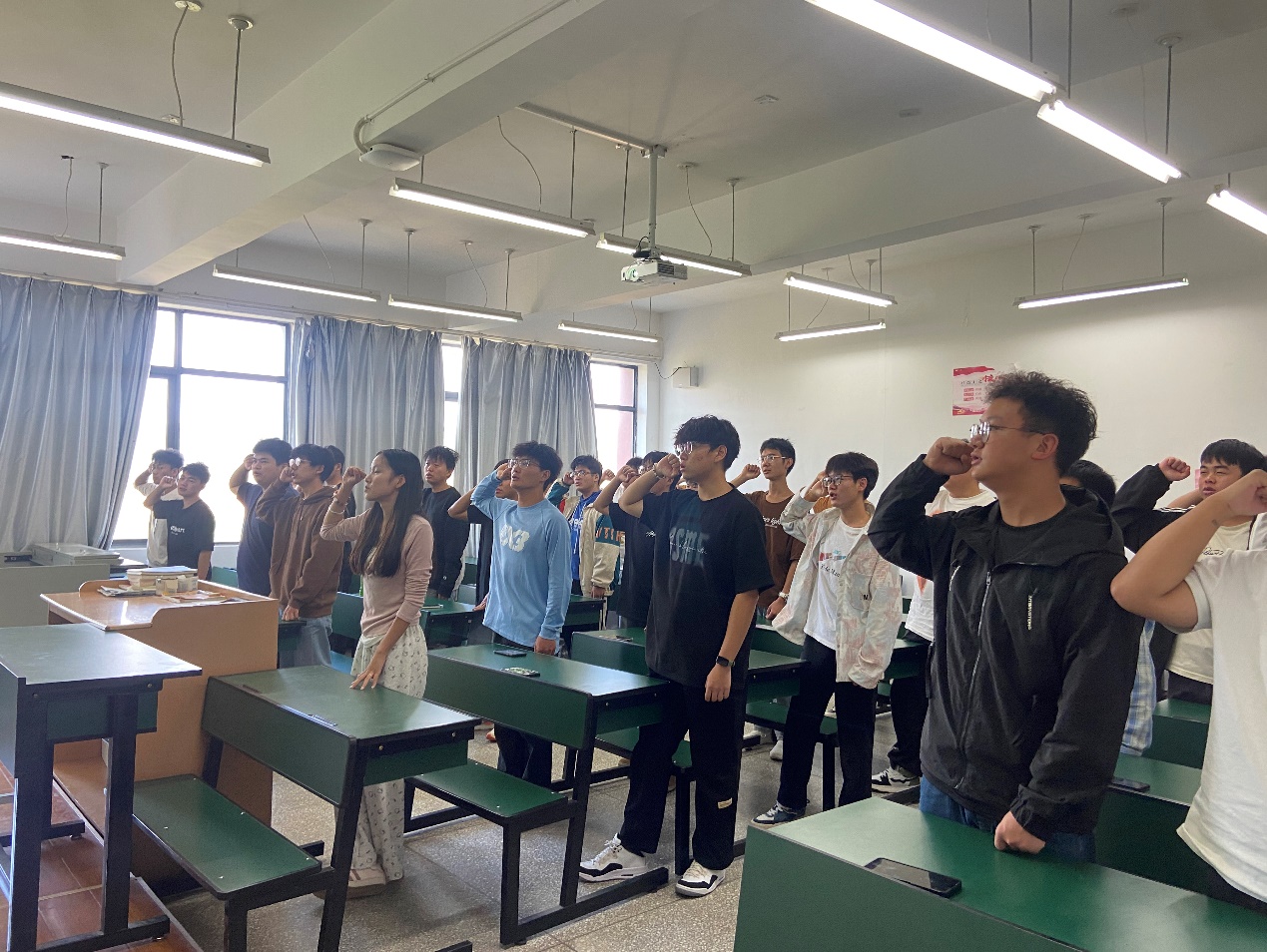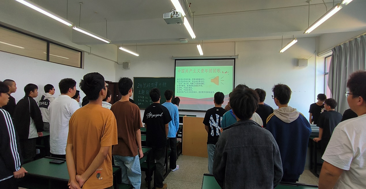 团支书费强带领同学们庄严宣读入团誓词,齐唱团歌《光荣啊,中国共青团》,同学们声音充满热情、坚定有力,表达了对党和国家的忠诚与热爱。