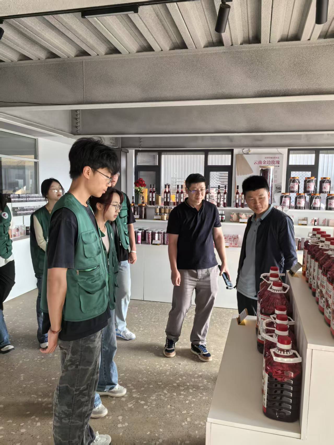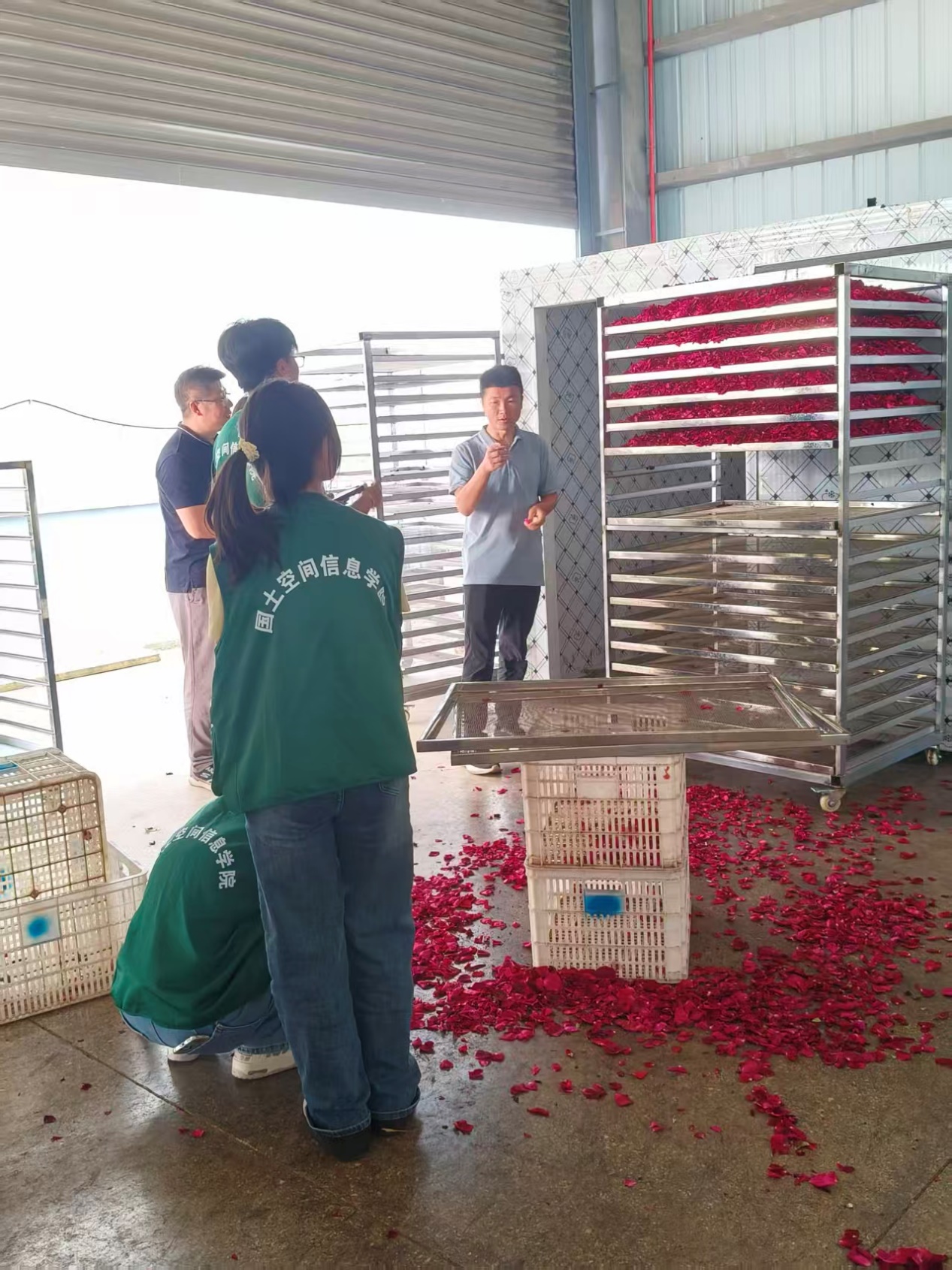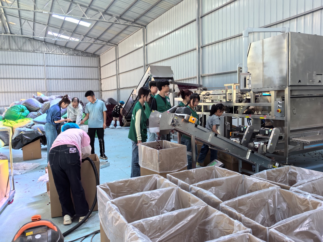 调研组参观了小河边村3000多亩标准化玫瑰花种植基地沈金祥副院长特别关注集中连片种植玫瑰花精细化种植与管理,建议用遥感与无人机、AI、机械自动化技术等结合的方式提升玫瑰花种植的精准化管理水平,提升玫瑰花采摘的自动化水平。瞿华老师则重点考察了产业用地布局,建议依托“多规合一”的村庄规划,进一步优化加工区与设施农用地的用地配置与布局。此外,调研组还参观了玫瑰花冻干、分拣初加工车间,以及花茶、花醋、精油等20余种产品展销区域。对玫瑰花产、二产、三产融合发展有了较为深入的了解和认识。值得一提的是,此次调研正逢“挑战杯”大学生创新创业大赛之际,世界杯体育官方网站的学生“创业小组”也借此机会深入了解玫瑰花产业发展状况,对玫瑰花新产品开发、文旅服务均表现了极大的兴趣,将在调研后进一步优化参赛作品。