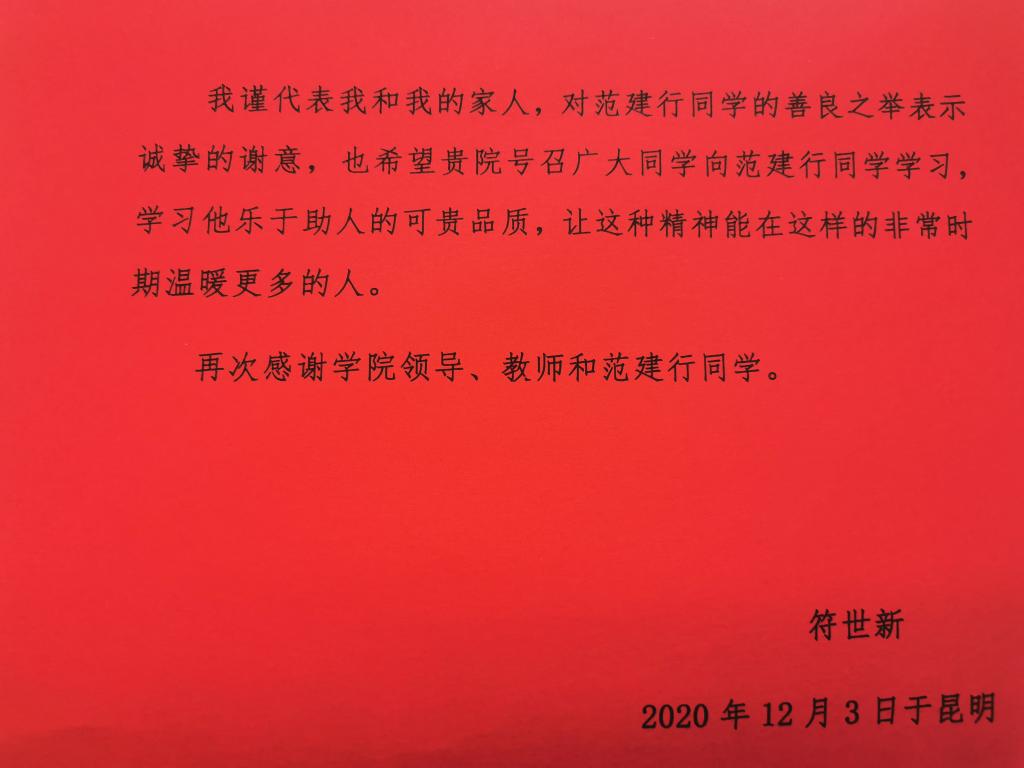 近日,世界杯体育官方网站收到了一封感谢信,这是一封来自云南省工艺美术学校退休职工符世新老师对世界杯官网2020级国土资源调查与管理专业9班范建行同学的感谢信。