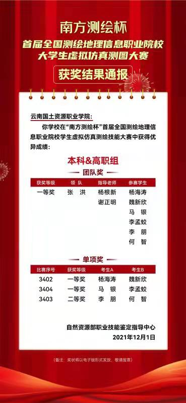 近日,由自然资源部职业技能鉴定指导中心和全国测绘地理信息职业教育教学指导委员会共同主办,重庆工程职业技术学院承办,广州南方测绘科技股份有限公司协办的“南方测绘杯”首届全国测绘地理信息职业院校大学生虚拟仿真测图大赛总决赛落下帷幕,世界杯官网师生取得团队一等奖和单项两个一等奖、一个二等奖的好成绩。