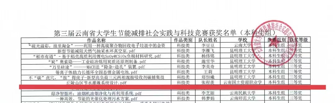 5月11日,由云南省高等学校能源动力类专业教学指导委员会主办,昆明理工大学、普洱学院承办的第三届云南省大学生节能减排社会实践与科技竞赛在普洱学院举行,世界杯体育官方网站22土管3班张程羡、黄兆威,土管2班马达氏、梅依然,土管1班李章熙,土管4班宋蔓利、赵双晴7位同学在瞿华蓥、邓传青等老师的指导下,凭借出色的创新能力和专业知识,在此次比赛中荣获了省级三等奖。