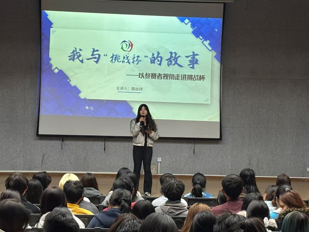 活动伊始,李文斌、陈蓉、何志仙、曹思雅四位同学依次登台,分享了各自的参赛项目与经验。随后,鄢丝祥同学对“挑战杯”赛事进行了系统全面的介绍。他首先阐明了两大类赛事的核心区别:“大挑”指“挑战杯”全国大学生课外学术科技作品竞赛,侧重于自然科学类学术论文的深度探索;而“小挑”即“挑战杯”中国大学生创业计划竞赛,涵盖五个主要组别,更加注重项目的商业价值与实践应用。两类赛事每两年交替举办。接着,他详细梳理了从校赛、省赛到国赛的三级赛制流程,并结合2026年“挑战杯”大学生创业计划竞赛的评审要点,深入解读了赛事规则与评分标准,帮助学生精准把握参赛方向,提升备赛效率与项目竞争力。