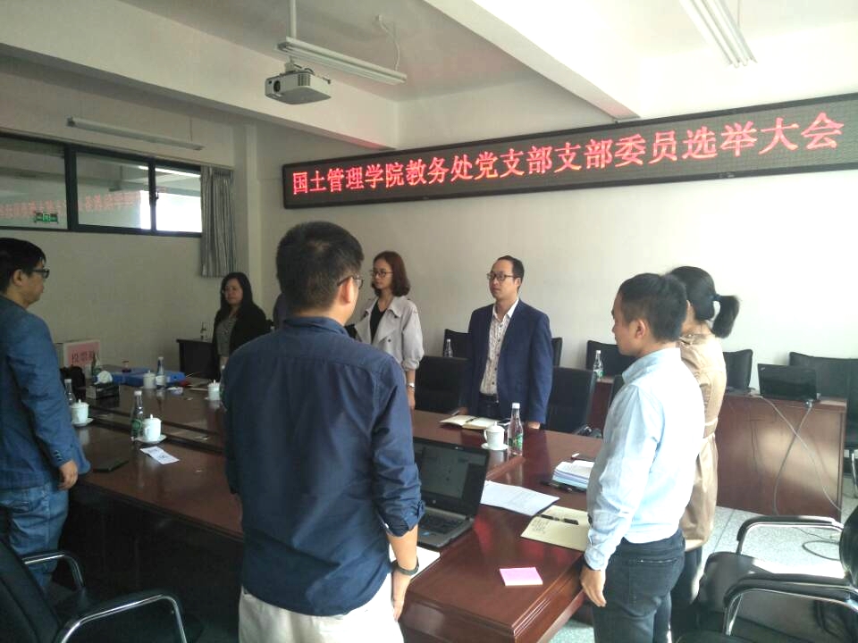根据《中共云南国土资源职业学院委员会关于成立党委办公室党支部等11个党支部的决定》(云国土学院党〔2019〕36号)文件精神,2019年9月3日下午15:30,国土管理学院党总支于明尚楼C411会议室召开教务处党支部第一届支部委员会委员选举大会。会议由教务处处长齐武福主持,学校党委委员、教务处处长齐武福,招生考试办公室副主任李艳,教务处副处长任友理及教务处·招生考试办公室其余党员老师参会,国土管理学院党总支副书记张俊妍、党总支纪检委员魏贵东列席会议。