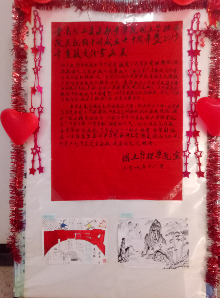 为庆祝新中国成立七十周年,激发广大学生的爱国情怀,积极响应学校关于《举办第六届廉政文化书画摄影展》的通知精神,进一步深化国土管理学院廉政文化建设,不断增强廉政文化的教育、示范、熏陶和导向作用,营造清正廉洁的校园文化氛围,国土管理学院举办此次书画大赛,在全院师生中征集书画作品。
