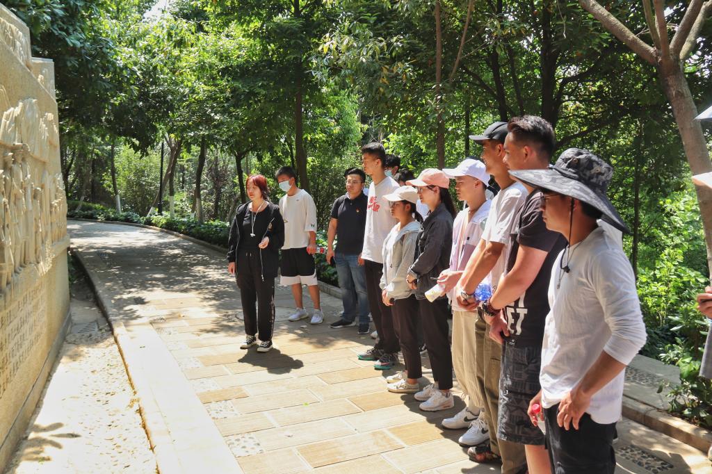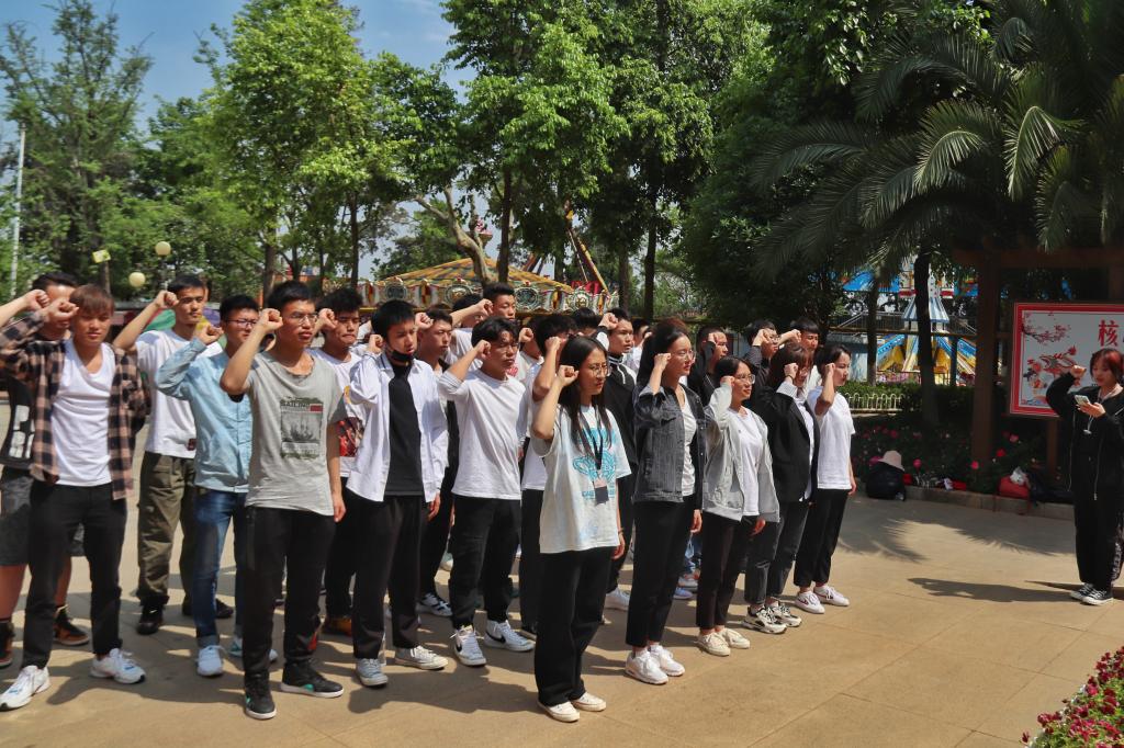 14日下午,马佳、陈宪勇两位老师带领同学们来到呈贡区三台山,首先参观了纪念壁,回顾了中国共产党走过的披荆斩棘、艰苦创业、开创新局的百年历程。接着,师生们来到英雄纪念碑前,看着矗立在公园中央的英雄纪念碑,他们无暇顾及头顶的烈日,集体三鞠躬并默哀一分钟以表示对烈士的悼念与缅怀。最后,由世界杯官网学生会主席杨文画同学领读入团誓词,同学们字字铿锵,气势激扬,那激昂的声音展现了同学们心中“凝心聚力听党话,不忘初心跟党走”的坚定信念。