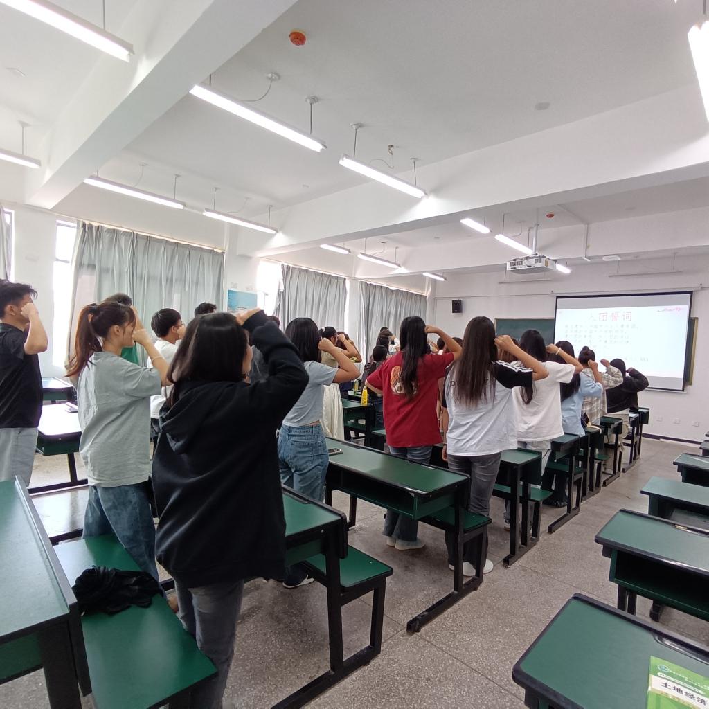 团支书胡敏带领同学们重温入团誓词,大家铿锵有力的声音饱含着青春的热血与坚定。随后,全体同学齐声高唱团歌,激昂的旋律和歌声在教室里回荡,激励着每一位同学为实现青春梦想而奋斗。同学们还集中学习了党的二十届三中全会精神,进一步认识到了青年一代在国家发展和民族复兴中的重要作用,决心以实际行动践行青年的责任与使命。