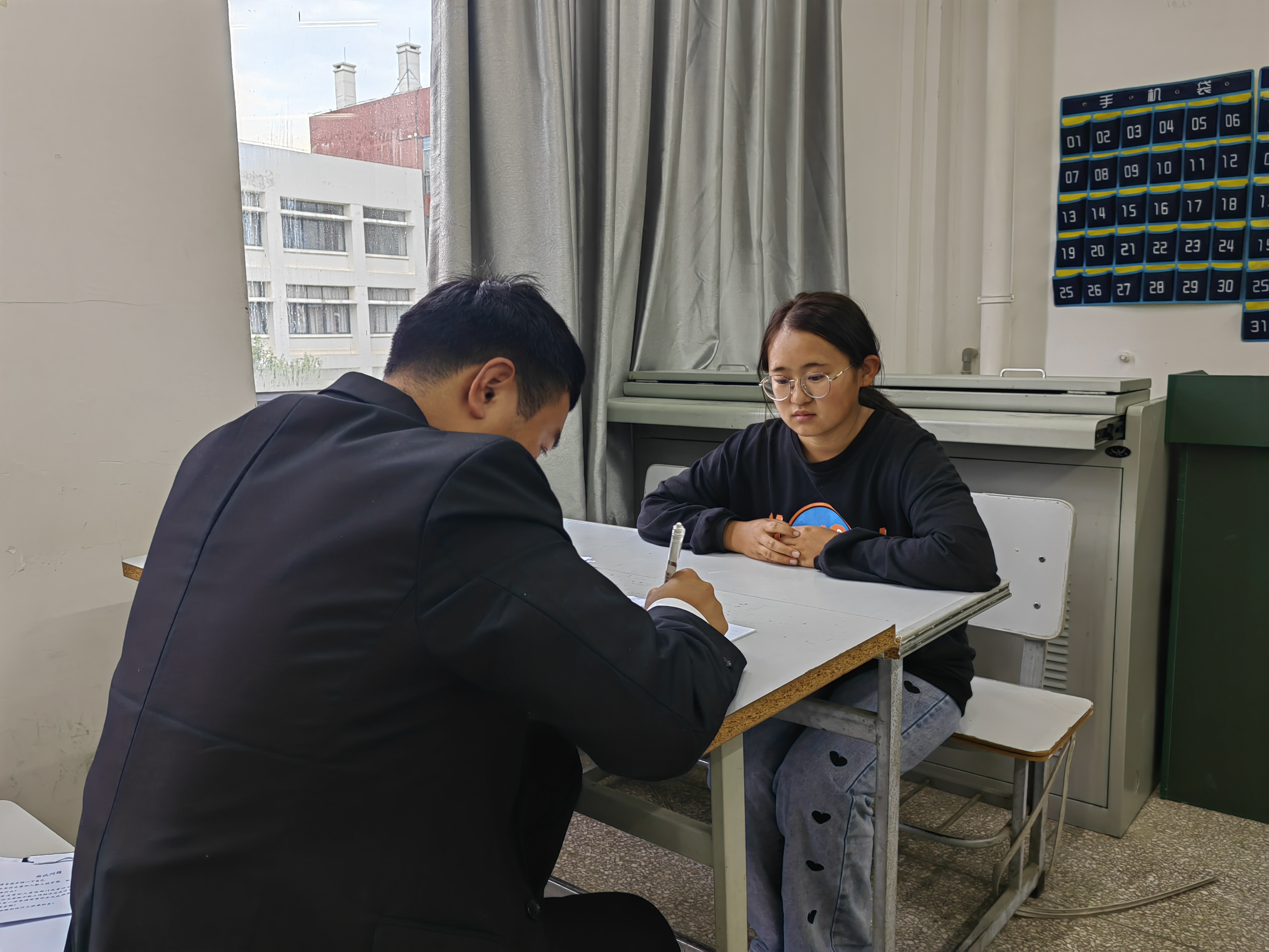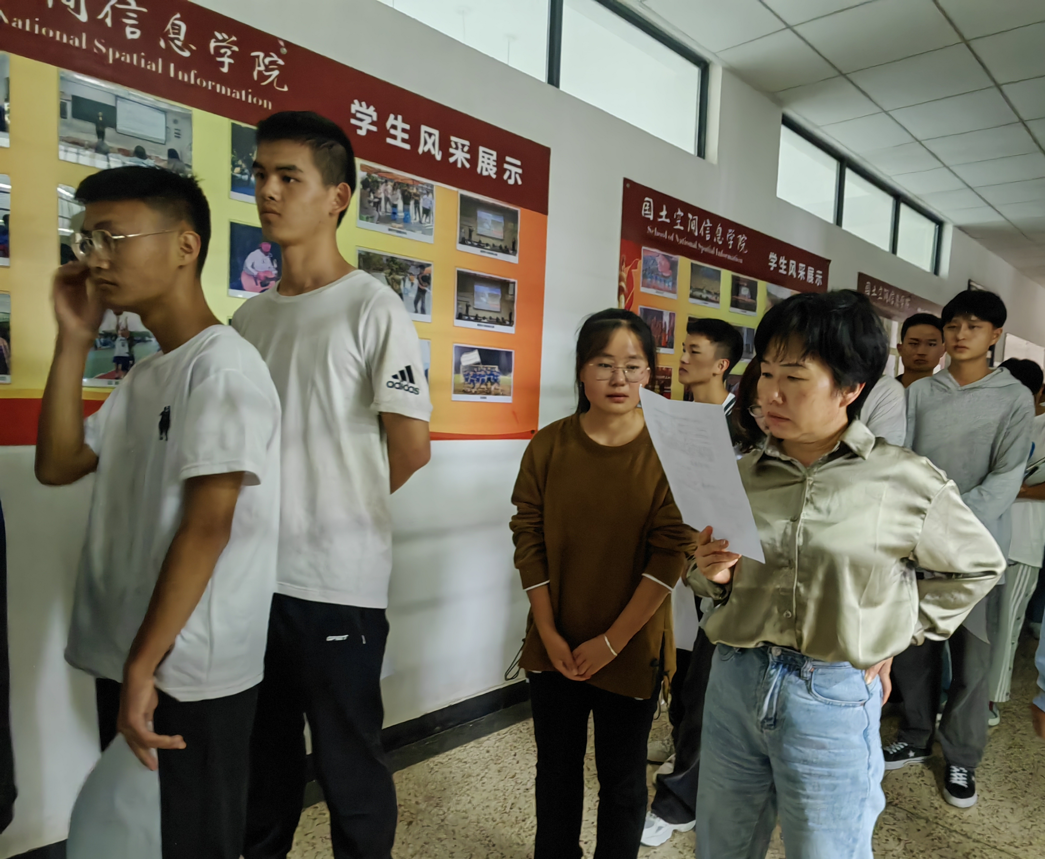 2022级前来参加面试的学生,井然有序地在教室外排队等待面试开始。学院党总支书记高昆,辅导员老师陈宪勇也在现场关注招聘情况,并与学生亲切交谈。