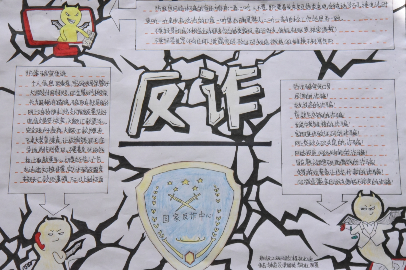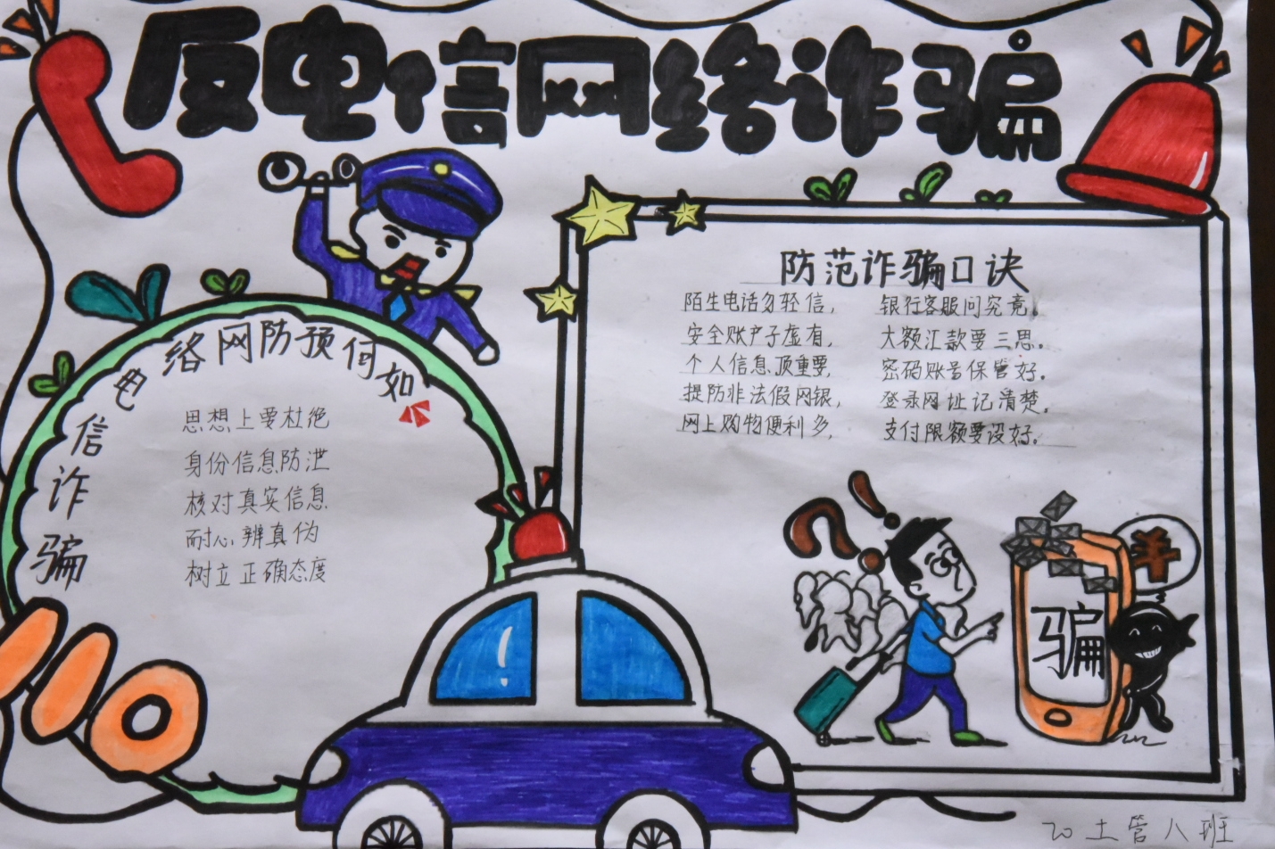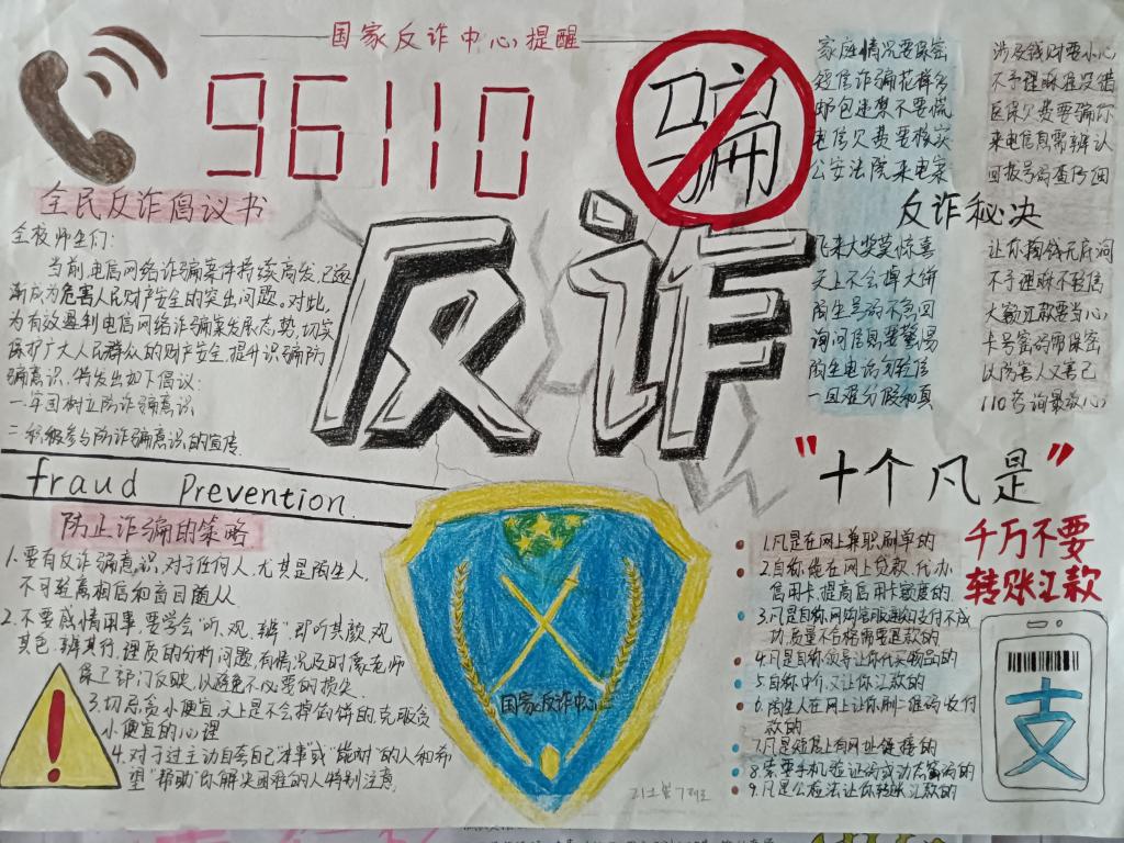 电信诈骗套路多、套路深,严重影响广大师生的财产安全和合法权益,不利于校园和谐与稳定。为增强学生防范电信网络诈骗的意识和能力,世界杯体育官方网站各班级学生积极制作防范电信网络诈骗手抄报,警示同学们要提高防范意识,避免上当受骗。