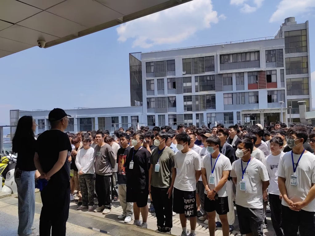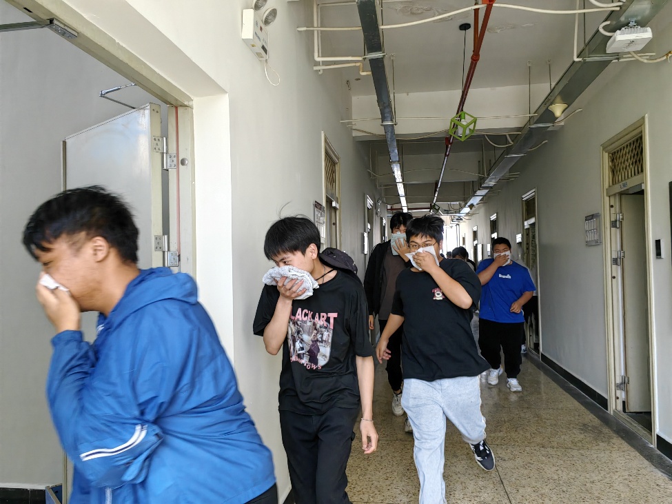 中午12:30,演练正式开始,袁锋老师再次向参与演练的师生们强调演练流程和注意事项。随着烟雾弹的点燃,报警器的响起,各楼层的同学们用湿毛巾捂住口鼻,迅速而有序地跑出宿舍,通过最近的消防疏散通道撤离到安全区域。在空旷处集合后,同学们按班级列队,老师迅速进行了人数清点,并将情况及时上报给袁锋老师。整个演练过程井然有序,无一人滞留现场,本次演练圆满完成。