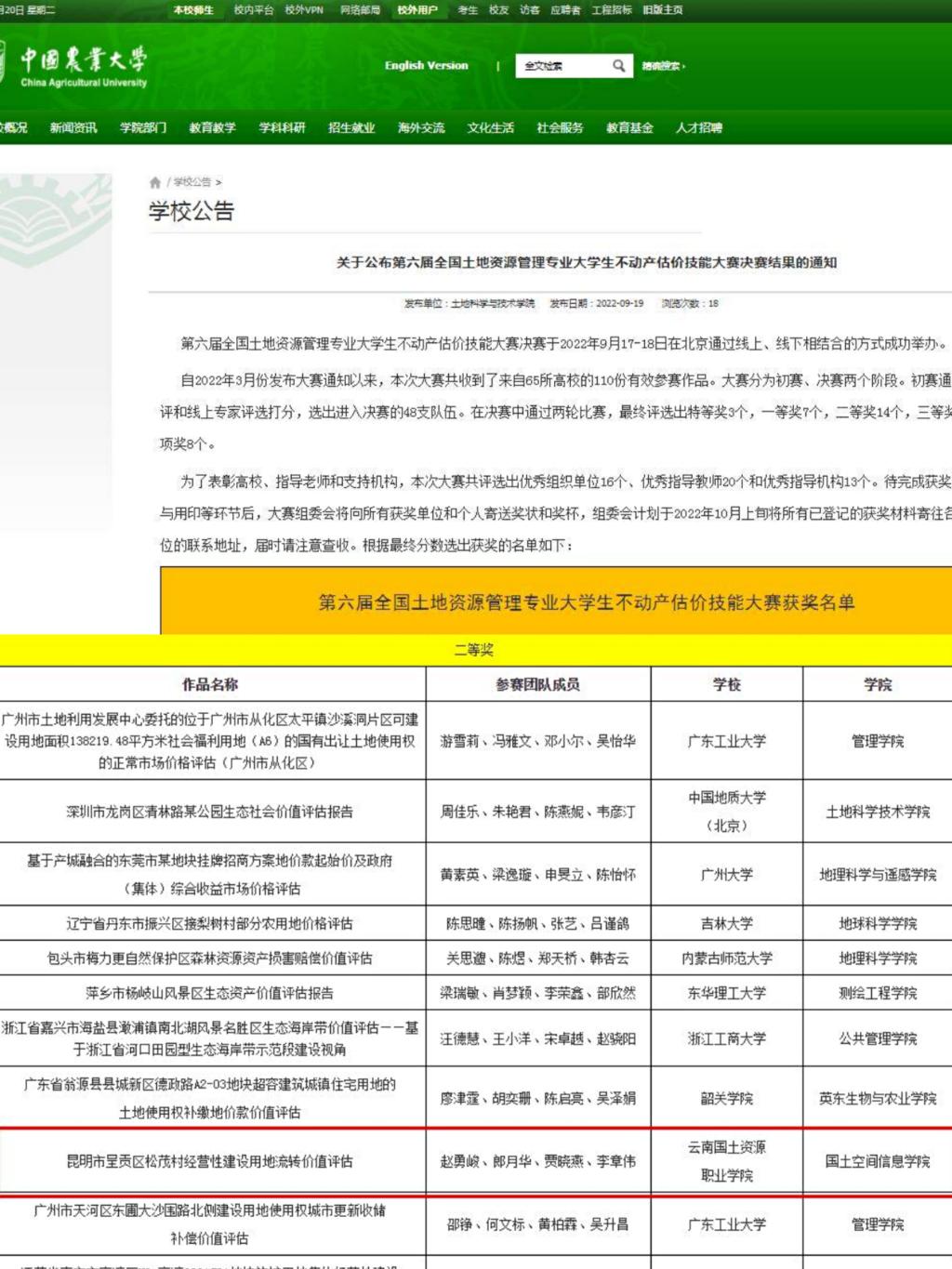 近日,由中华人民共和国教育部公共管理类教学指导委员会、全国高校土地资源管理院长联席会主办,中国农业大学和中国土地估价师与土地登记代理人协会承办的第六届全国土地资源管理专业大学生不动产估价技能大赛决赛落下帷幕,世界杯体育官方网站邓传青、薛荣莉两位老师带队指导学生荣获佳绩。
