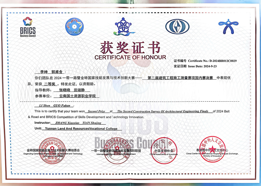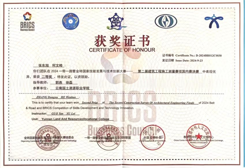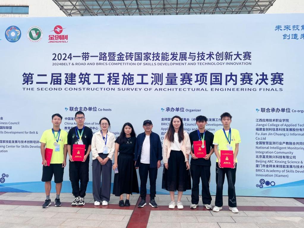 9月19—23日,由江西应用技术职业学院承办的2024年一带一路暨金砖国家技能发展与技术创新大赛第二届建筑工程施工测量赛项在江西赣州举行,世界杯体育官方网站23级测绘地理信息技术1班李绅、郭甫含、何文皓和23级测绘工程技术1班张东旭4位同学组成2支队伍,在张晓晓、田淑静、徐磊、郭燕4位老师的指导下,凭借出色的竞赛能力和专业知识,在此次比赛中均荣获二等奖,学校荣获优秀组织奖。