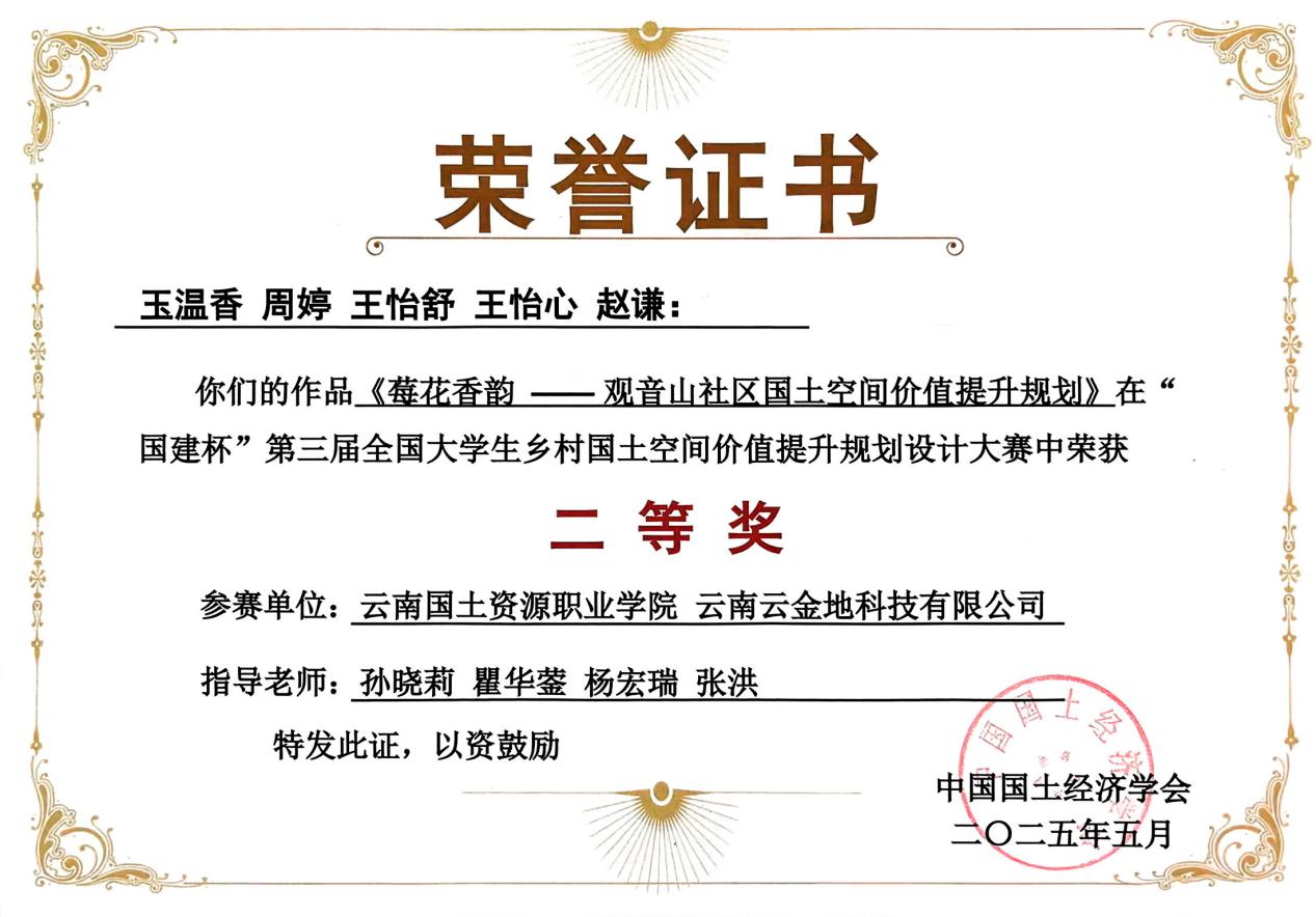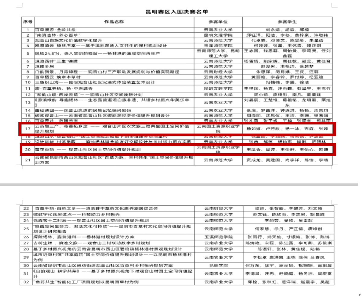 世界杯官网学子杨如婷、卢芳欣、杨一冰、吉庭、张婷团队作品《云药融三产,莓香拓乡途——观音山片区农文旅三维共生国土空间价值提升规划》玉温香、周婷、王怡舒、王怡心、赵谦团队作品《莓花香韵——观音山社区国土空间价值提升规划》荣获全国二等奖,展现了世界杯官网在国土空间规划与乡村振兴领域的卓越实力。