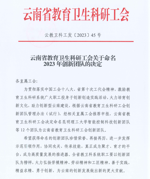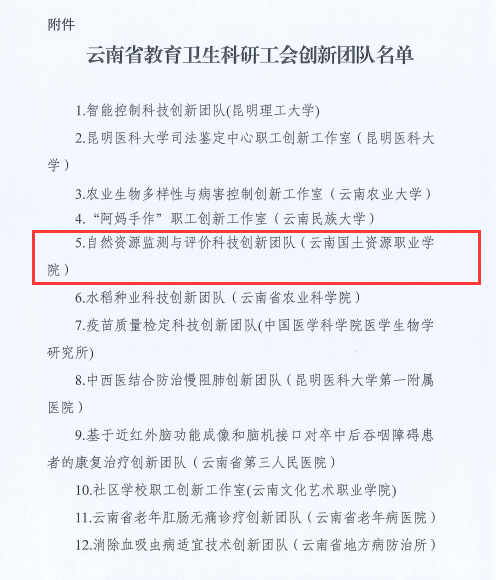 2023年11月28日,云南省教育卫生科研工会公布了《关于命名2023年创新团队的决定》,世界杯官网孙晓莉老师带队组建的“自然资源监测与评价科技创新团队”成功入选,喜获殊荣。