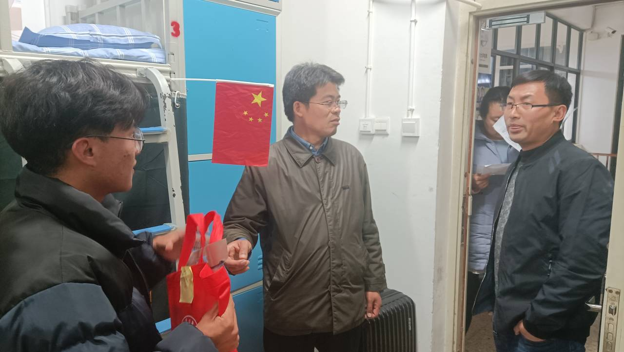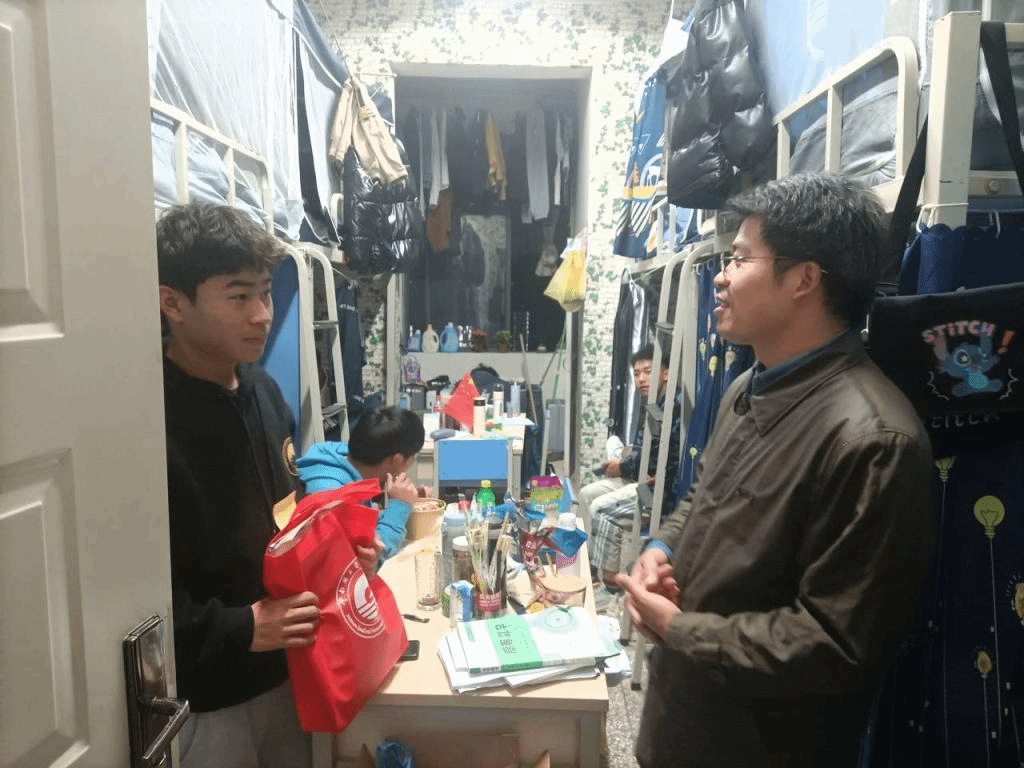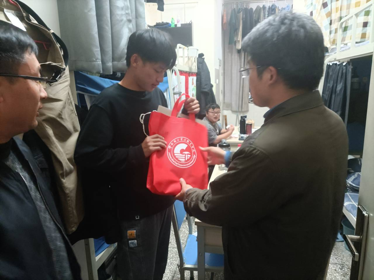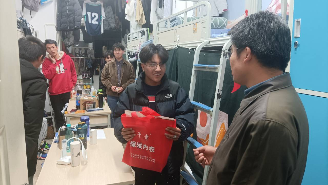 老师们到达宿舍后,亲手将保暖内衣交到每一位受助同学手中,并亲切地和同学们交谈,了解同学们的住宿环境、近期学习生活情况,并叮嘱临近期末考试要抓紧时间好好复习。李广涛老师同时提醒同学们要按时打扫宿舍卫生,保持一个干净整洁舒适的环境。